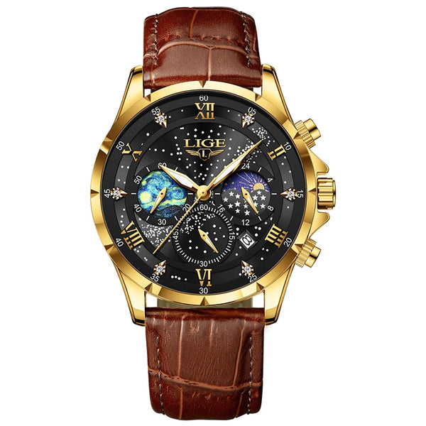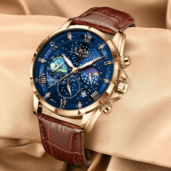 Movement: Quartz Clasp Type: Buckle Water Resistance: 3Bar Dial Diameter: 42mm Band Width: 22mm Band Length: 240mm Case Thickness: 11mm Band Material: Leather Case Material: Stainless Steel Dial Window Material: Hardlex Feature: Luminous Hands, Auto Date, Complete Calendar, Moon Phase, Stop Watch Note: 3Bar indicates resistance from water splash only